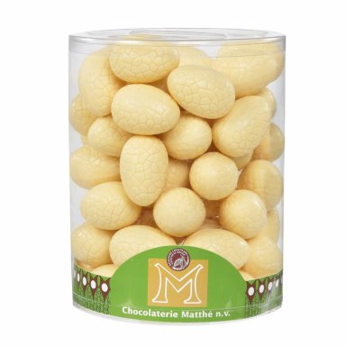 Matthé Eieren Wit in Tubo zijn fijne holle paaseitjes in romige witte chocolade met een zachte en zoete smaak. Met een hoogte van ongeveer 6 cm en een gewicht van 18 gram per stuk zijn deze eitjes ideaal voor losse verkoop of paasacties.